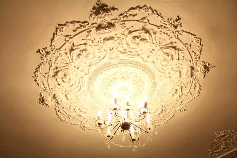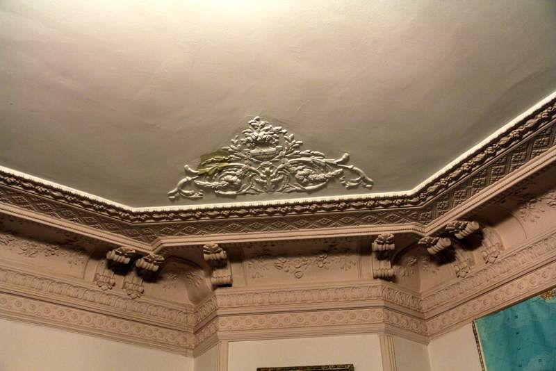 Біля будинку досі збереглася ліпнина на стелях та оригінальний кований навіс над ганком.