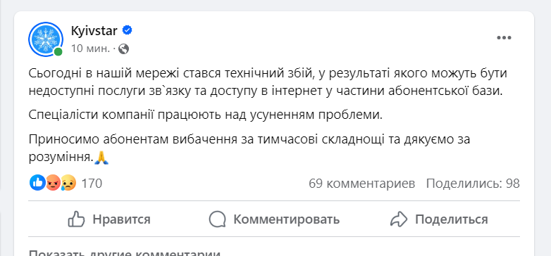 На сторінці Kyivstar у ФБ заявили, що "стався технічний збій, у результаті якого можуть бути недоступні послуги зв`язку та доступу в інтернет у частини абонентської бази".
