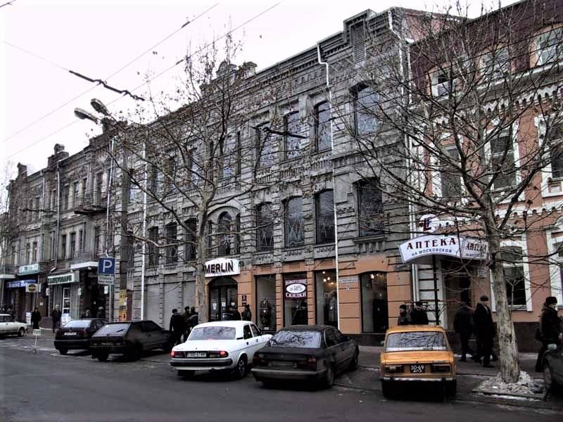 Навпроти ЦУМу в Дніпрі знаходиться невелика стара триповерхова будівля. Їй вже понад 100 років і за все своє довге «життя» цей будинок встиг побувати і прибутковим будинком, і комунальною квартирою, а зараз – це невеликий торговий центр з офісами та магазинами. Зараз будівля пофарбована в жовтий колір, але початковий колір – червоний. Збудована вона з катеринославської пластичної цегли.