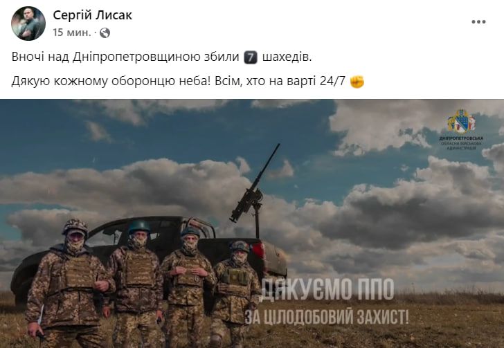 “Вночі над Дніпропетровщиною збили 7 шахедів. Дякую кожному оборонцю неба! Всім, хто на варті”, - написав Сергій Лисак.