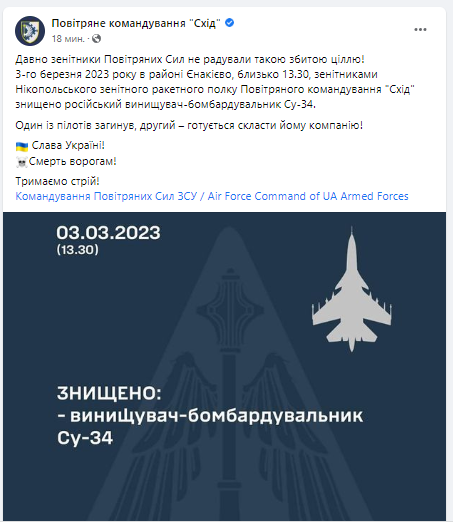 Сьогодні, 3 березня, в районі Єнакієво близько 13:30 зенітники Нікопольського зенітного ракетного полку Повітряного командування "Схід" знищили російський винищувач-бомбардувальник Су-34.