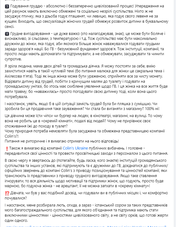 Ситуація, яка сталася зі мною сьогодні, настільки дика і огидна, що мені важко і досі повірити в її реальність, але на жаль. Дніпро, ТЦ Караван, магазин одягу Colin’s. Я з чоловіком і сином-немовлям обираю собі на примірку дві пари джинсів, в цей час малий починає плакати з вимогою їсти. Ми беремо джинси і йдемо до примірочної для годування і примірки. Будній день, всі, окрім однієї роздягальні, вільні. Я сідаю і починаю годувати, чоловік стоїть з візочком навпроти і чекає, аби забрати сина і дати мені джинси. В цей час повз роздягальню проходить консультантка, бачить мене, зупиняється і видає (діалог трохи скорочено): «В нас не можна годувати. Це заборонено правилами магазину. В ТЦ для цього є окрема кімната!» В мене першу секунду відняло мову, оговталась - кажу: «Правилами магазину? Ви впевнені? А якщо моїй дитині треба зараз поїсти?» І тут вона, остаточно втрачаючи людське обличчя, видає фразу, від якої на мене рухнула стеля: «Ну годувати це ж як в туалет ходити, для цього є окреме приміщення", - пише жінка.