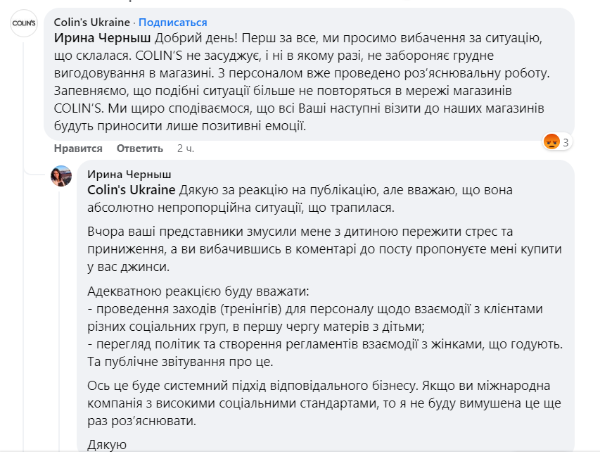 Оновлено: пізніше Colin’s Ukraine залишила свій коментар під дописом Ірини. Компанія попросила вибачення в жінки та повідомила, що з персоналом провели роз’яснювальну роботу.
