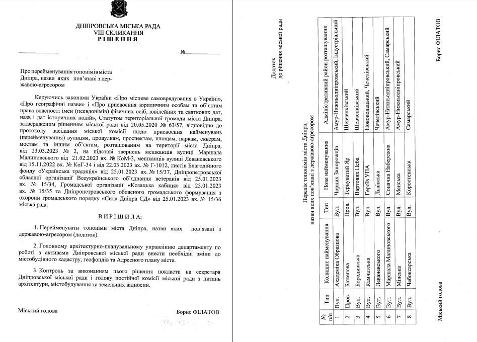 Найближчим часом у Дніпрі можуть змінити назви ще восьми вулиць, топоніми яких пов'язані з РФ та СРСР. Як зазначено в проєкті рішення опублікованому на сайті міськради, перейменують такі вулиці: