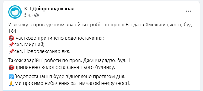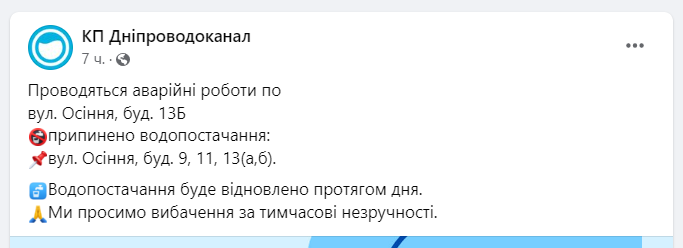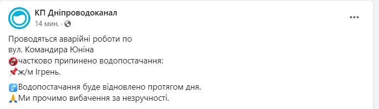 Причина - проведення аварійних робіт на вул. Командира Юніна.