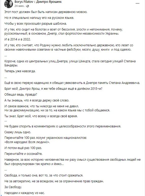 Одна із центральних вулиць Дніпра, вулиця Шмідта, стала сьогодні вулицею Степана Бандери. Тепер уже назавжди. Ще у свою першу каденцію я обіцяв увічнити у Дніпрі пам'ять Степана Андрійовича. Брате мій, Дмитре Яроше, я ж тобі обіцяв ще в далекому 2015-му? Адже обіцяв, правда? А ти знаєш, що я завжди тримаю своє слово, - написав Борис Філатов.