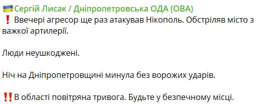 В інших районах Дніпропетровської області ніч минула з повітряною тривогою, але без обстрілів.