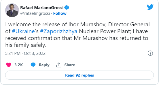 Я вітаю звільнення генерального директора Запорізької АЕС України Ігоря Мурашова. Я отримав підтвердження, що пан Мурашов благополучно повернувся до своєї родини, - пише Гроссі у Twitter.