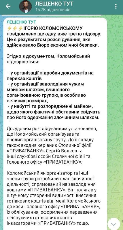 Нагадаємо, раніше ми писали, що 7 вересня детективи НАБУ за погодження керівника САП повідомили колишньому кінцевому бенефіціарному власнику ПриватБанку Ігорю Коломойському та п’ятьом членам організованої ним групи про підозру у заволодінні коштами банку на суму понад 9,2 млрд грн.