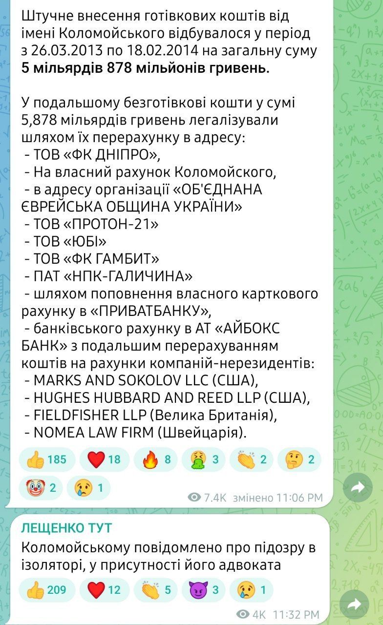 Надалі ці кошти легалізували шляхом їх перерахунку на різні рахунки, зокрема, на власний рахунок Коломойського; ТОВ «ФК Дніпро»; на адресу організації «Об'єднана єврейська община України»; ТОВ «Протон-21» тощо.