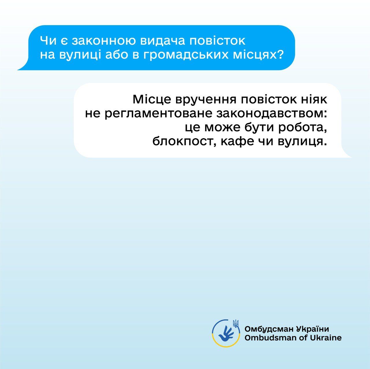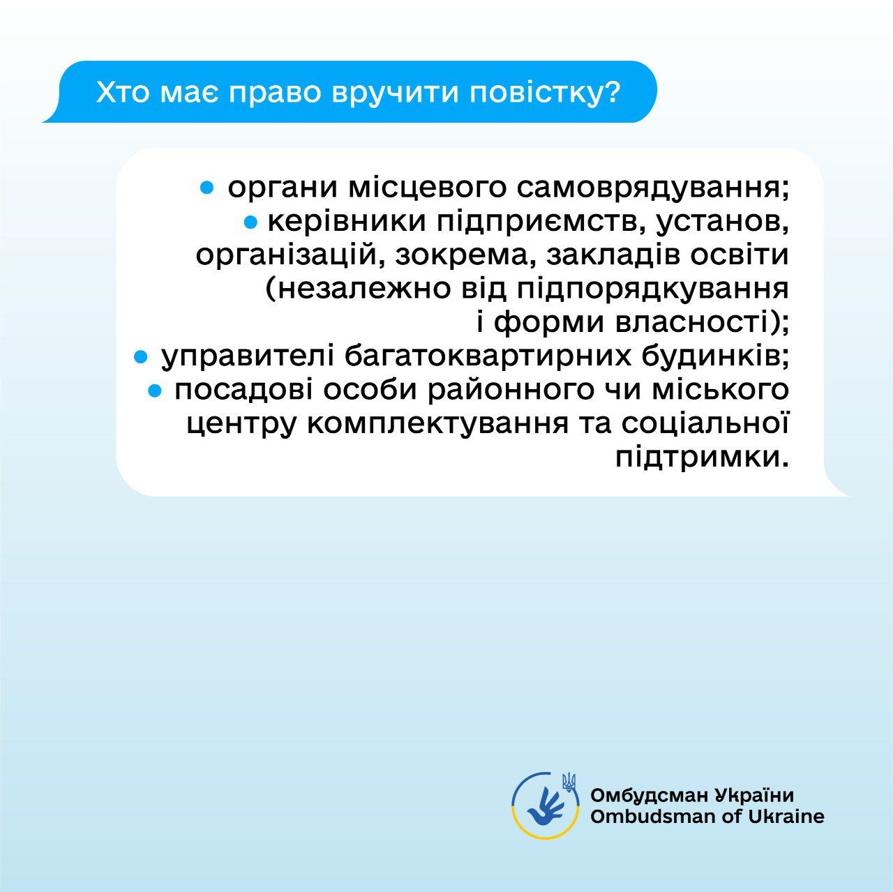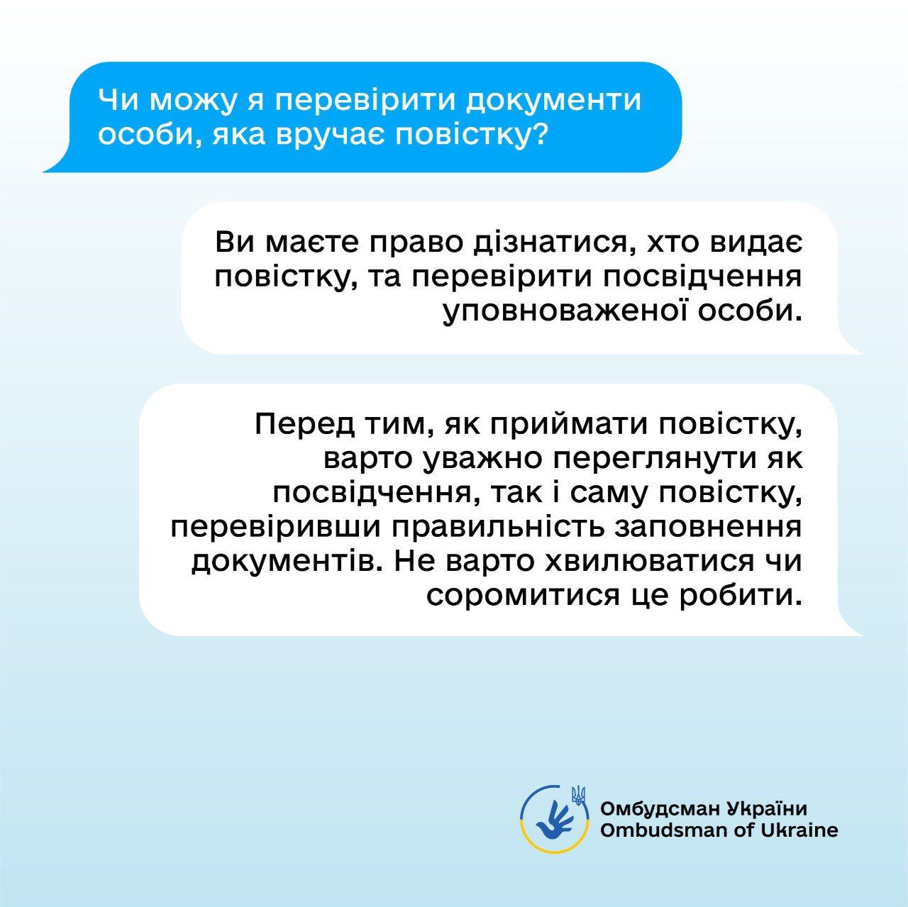 Також омбудсман підкреслив, що той, кому вручають повістку, має право дізнатися, хто її видає, та перевірити посвідчення уповноваженої особи.