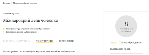 Чоловік на ім’я Олександр Слуцький 13 березня створив петицію з проханням зробити Міжнародний день чоловіка, який у світі відзначають 19 листопада вихідним днем. Поки що за це проголосували 8 осіб із необхідних 25 тис.