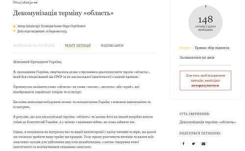 Президента просять «декомунізувати термін «область», успадкований від СРСР та замінити його на словосполучення «земля», «волість», «край», що відображають українську культуру та історію. Ця зміна допоможе побудувати сильну та самодостатню україну з власною ідентичністю та культурою».