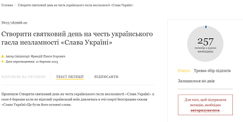 Також Главу держави просять встановити нове свято на честь слів «Слава Україні!». Відзначати його хочуть 6 березня та просять, щоб цей день був вихідним.