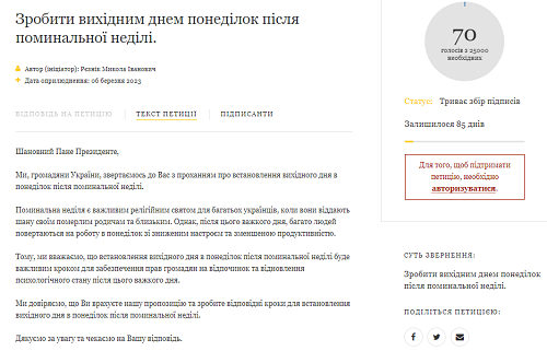 Просять Президента зробити вихідним днем і понеділок, що настає за поминальною неділею, яка йде після Великодня. У петиції сказано, що «поминальна неділя є важливим релігійним святом для багатьох українців, але після цього важливого дня багато хто йде у понеділок на роботу з поганим настроєм та меншою продуктивністю», - сказано в тексті петиції.
