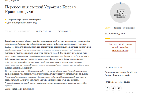 Цього року на сайті петицій з'явилося одразу дві пропозиції щодо перенесення столиці з Києва до інших регіонів України. Президенту пропонують перенести столицю до Кропивницького. Автор документа заявляє, що якщо перемістити столицю до Кіровоградської області, то окупантам у майбутньому у разі чого важко її захопити так, як вони захопили Київську область.