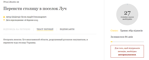 Також Володимира Зеленського просять перенести столицю до селища Луч Миколаївської області. Якихось аргументів автор не наводить, просто каже, що місто зруйноване окупантами, його треба відновити та перенести туди столицю.