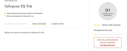 Просять Президента та заборонити платформу Tik-Tok в Україні. Аргументів ініціатор петиції не наводить, але просить розглянути його пропозицію.