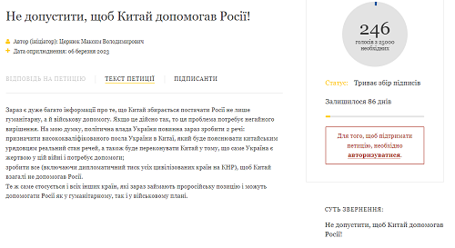 Крім цього, просять Володимира Зеленського «не допустити, щоб Китай допомагав росії!» Автор петиції каже, що є інформація про те, що влада КНР постачатиме снаряди Росії і якщо це правда – то влада України має негайно вжити заходів. Також він дає поради, що треба робити.