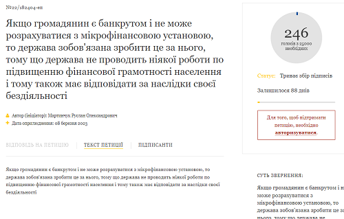Ініціатор однієї з петицій на сайті просить, щоб держава розраховувалася за кредитами своїх громадян у мікрофінансових організаціях (не банках), якщо громадянин визнає себе банкрутом. Причина, через яку на це потрібно виділити кошти з бюджету на думку автора в тому, що держава не турбувалась про фінансову грамотність громадян, не проводила жодної роз'яснювальної роботи на цю тему, а отже побічно винна в тому, що люди набралися кредитів під великі відсотки та не можуть виплатити їх. Тому держава повинна також відповідати на «наслідки своєї бездіяльності».