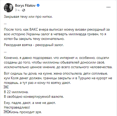 Після того, як ВАКС учора виписав моєму візаві рекордну за всю історію України заставу у чверть мільярда гривень, то я хотів би закрити тему остаточно. Рекордний хабар - рекордна застава, - написав він.