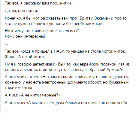 Так ось, я розповім вам про... нитки. Так-так, про нитки. Звичайно, я міг би розповісти вам про "Бритву Оккама" і про те, що не потрібно плодити сутності без необхідності. Але до чого ці філософські екзерсиси? Кому вони цікаві? Отож, коли я прийшов у НАБУ, то побачив на столі моток ниток. Жирний такий моток. Ну я й говорю детективам: «Ви що, як єврейський кравець Ізя зі старого анекдоту строчите тут кальсони для Червоної Армії?» А вони мені у відповідь: "Ні, ми нитками зшиваємо кримінальні справи, ну, звичайно, у нас є електронний документообіг, але паперовий теж є". А я їм: «А чого нитки чорні?» А вони мені: «А ми не шиємо справи білими нитками. Так зрозуміліше?"