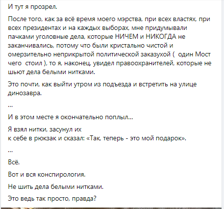 І тут я прозрів. Після того, як за весь час мого мерства, при всій владі, при всіх президентах і на кожних виборах, мені вигадували пачками кримінальні справи, які НІЧИМ і НІКОЛИ не закінчувалися, бо були кришталево чистою та огидно неприкритою політичною заказухою (один Міст чого вартий), то я, нарешті, побачив правоохоронців, які не шиють справи білими нитками. Це майже як вийти вранці з під'їзду і зустріти на вулиці динозавра.