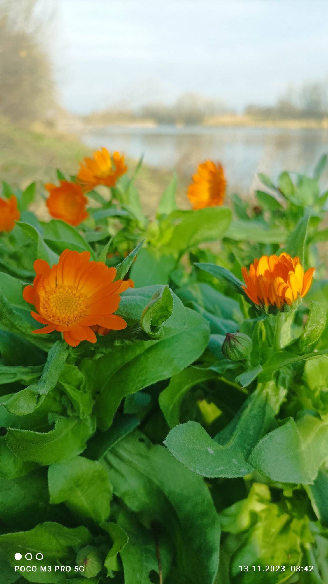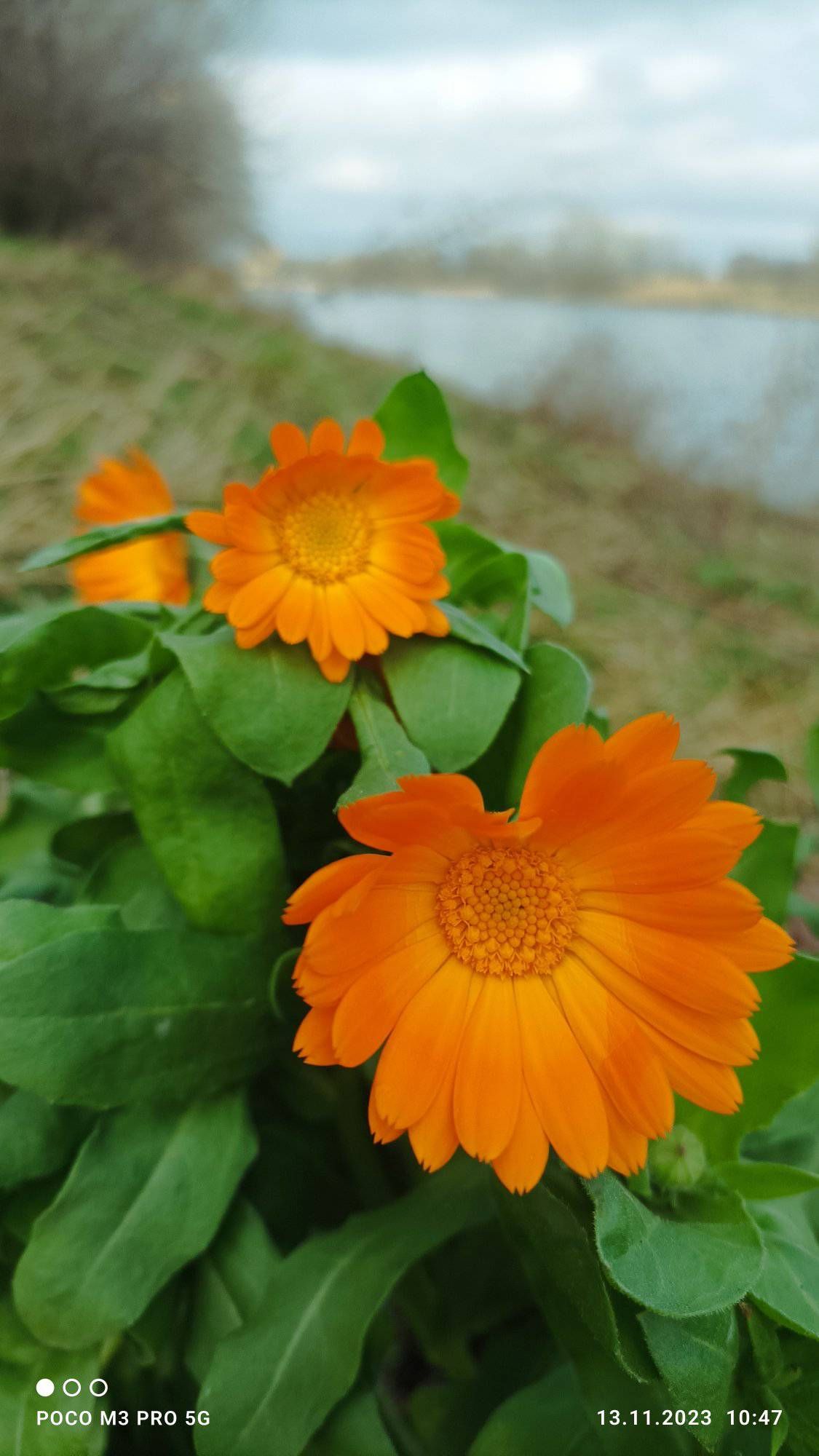 Осінь-23. Біля водойми горять помаранчеві вогники... Нагідки лікарські (календула лікарська). Дніпропетровщина. Приорілля. 13.11.2023 рік, - підписав він фото.