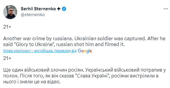 Ще один військовий злочин росіян. Український військовий потрапив у полон. Після того, як він сказав "Слава Україні", росіяни вистрілили в нього і зняли це на відео, — написав український активіст і блогер Сергій Стерненко на своїй сторінці у Twitter.