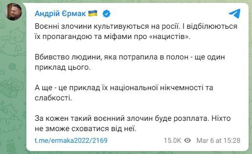 Воєнні злочини культивуються на росії. І відбілюються їх пропагандою та міфами про "нацистів". Вбивство людини, яка потрапила в полон — ще один приклад цього. А ще — це приклад їх національної нікчемності та слабкості. За кожен такий воєнний злочин буде розплата. Ніхто не зможе сховатися від неї, — написав голова Офісу Андрій Єрмак.
