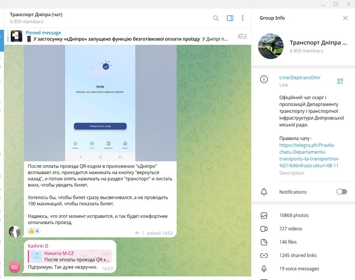Мешканці Дніпра, які користуються мобільним застосунком "єДніпро" для оплати проїзду, стикаються з певними незручностями. Після сканування QR-коду квиток не відображається одразу, що створює додаткові труднощі для пасажирів. Про це повідомив користувач у чаті Телеграм-каналу "Транспорт Дніпра".