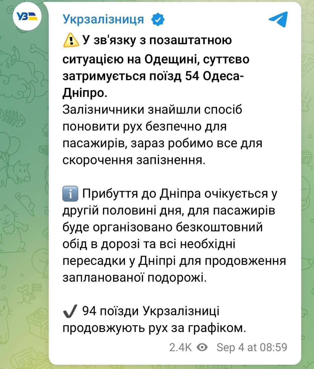 У зв'язку з позаштатною ситуацією на Одещині суттєво затримується поїзд №54 Одеса-Дніпро.