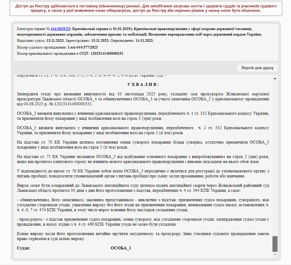 Про це йдеться у Єдиному державному реєстрі судових рішень.