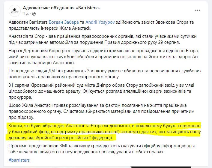 Проте на сторінці Анастасії на Facebook є репост від адвокатського об'єднання, юристи якого стверджують, що представляють інтереси патрульної.
