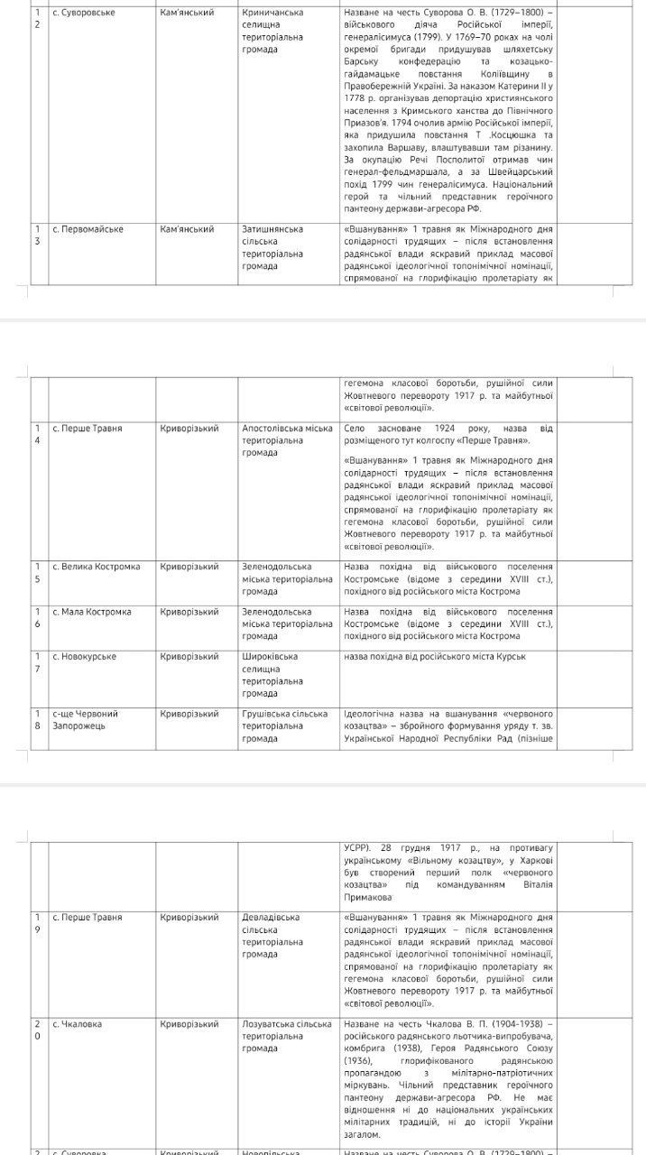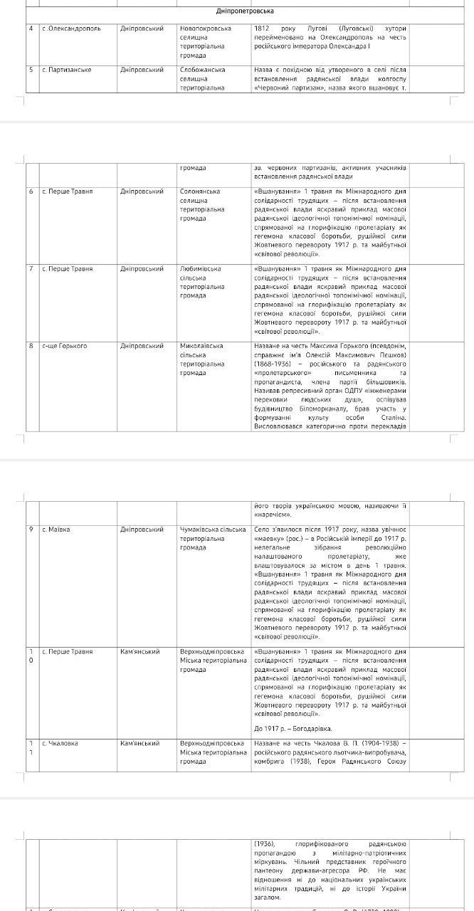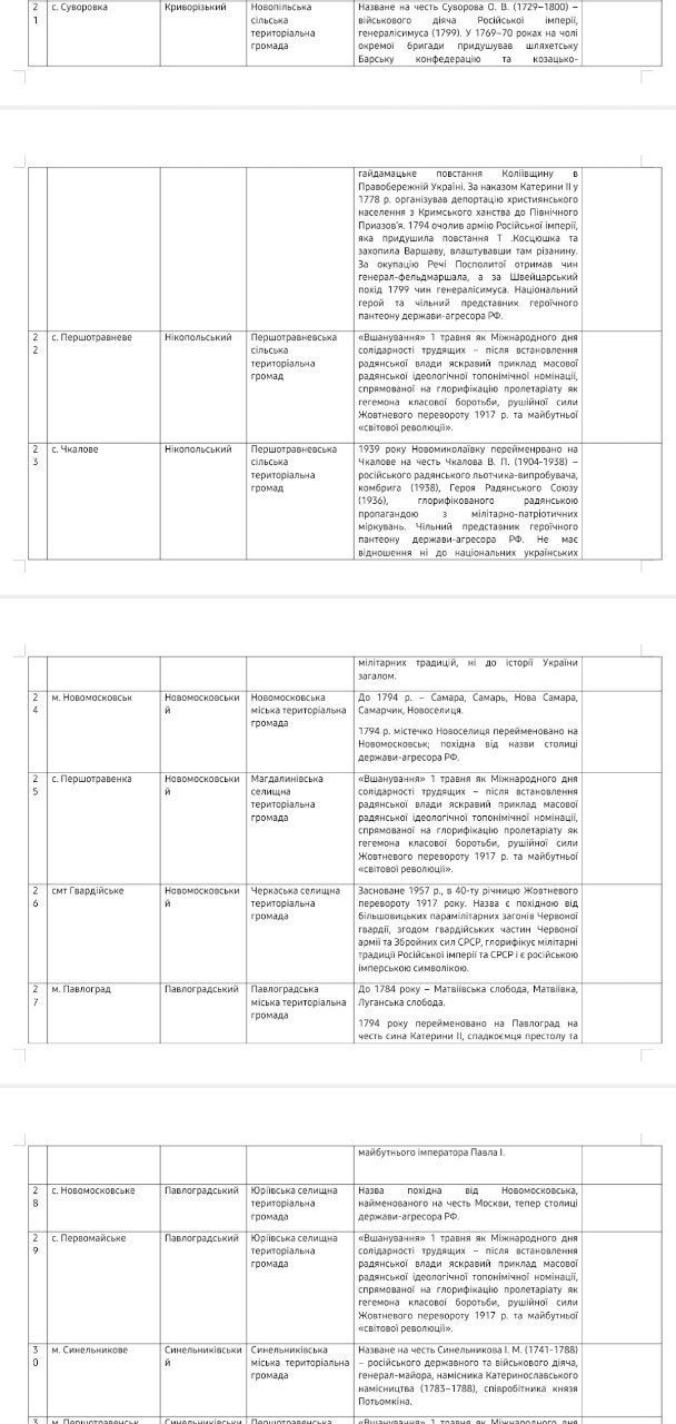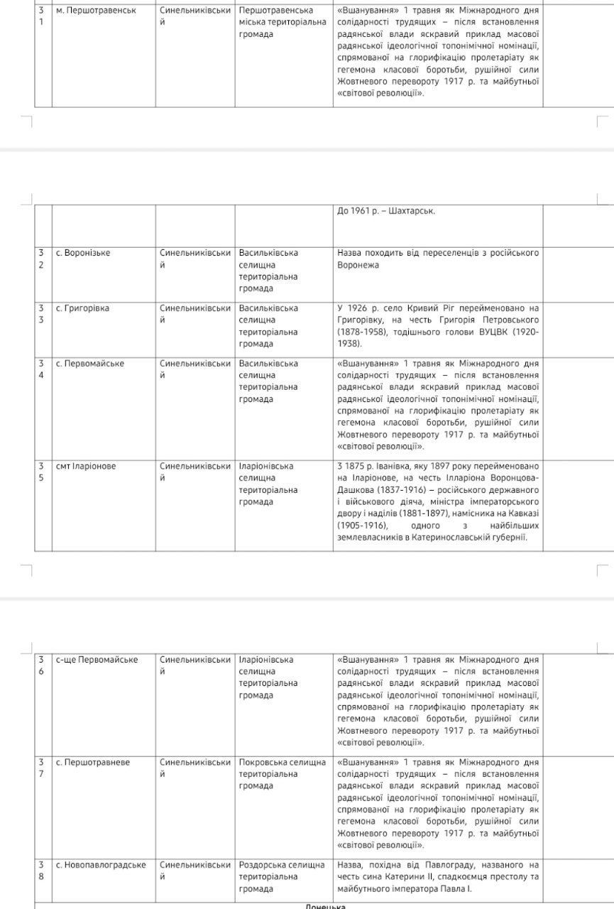 Наприклад, до цього переліку увійшли: Новомосковськ - адже це похідна від назви столиці держави-агресора рф: Павлоград - адже так його перейменували на честь сина Катерини ІІ Павла І; Синельникове - адже це назва на честь російського державного та військового діяча Синельникова І. М.; Першотравенськ - адже це яскравий приклад масової радянської ідеологічної топонімічної номінації; Гвардійське - адже це похідна від більшовицьких парамілітарних загонів Червоної гвардії тощо.