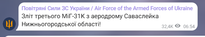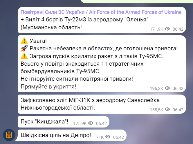 За інформацією Повітряних сил ЗСУ, наразі у повітрі перебувають 11 стратегічних бомбардувальників Ту-95МС, 4 борти Ту-22м3 та МіГ-31К. Перші ракети уже в повітряному просторі України.