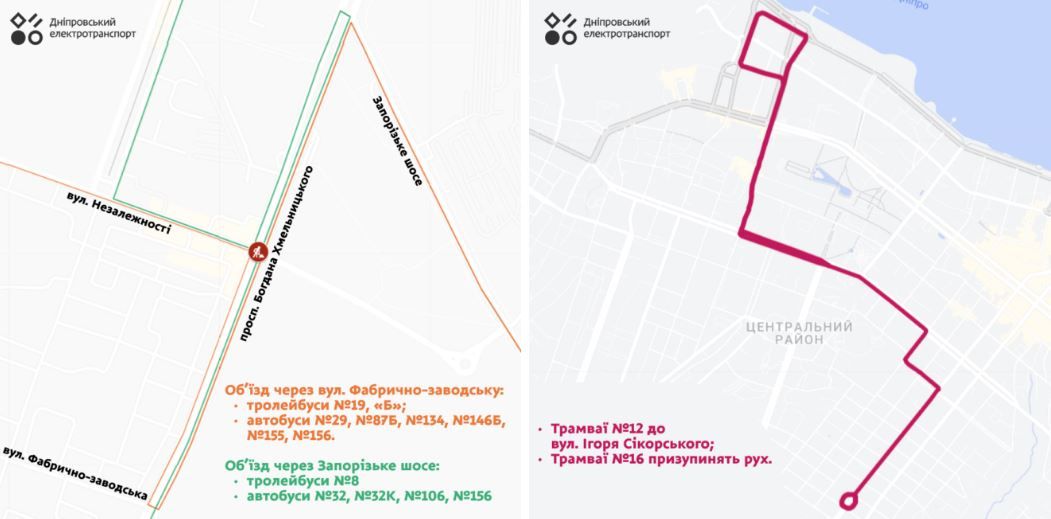 - тролейбуси № 8 та автобуси № 32, № 32К, № 106, № 156 рухатимуться через перехрестя просп. Богдана Хмельницького — Запорізьке шосе.