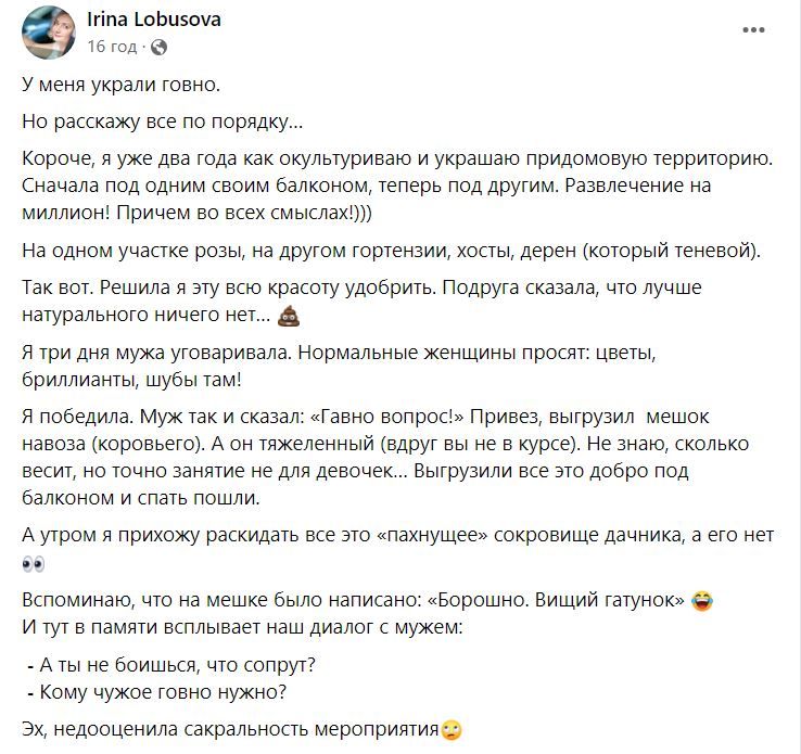 Я перемогла. Чоловік так і сказав: "Гівно питання!" Привіз, вивантажив мішок гною (коров'ячого). А він важкий (раптом ви не знаєте). Не знаю, скільки важить, але заняття не для дівчаток… Вивантажили все це добро під балконом і піти пішли. А вранці я приходжу розкидати весь цей «скарб» дачника, що пахне, а його немає, - розповідає Ірина.