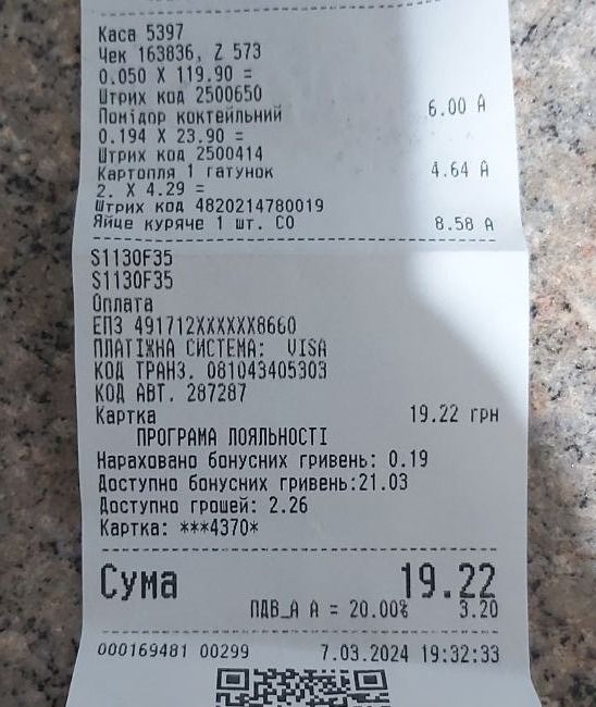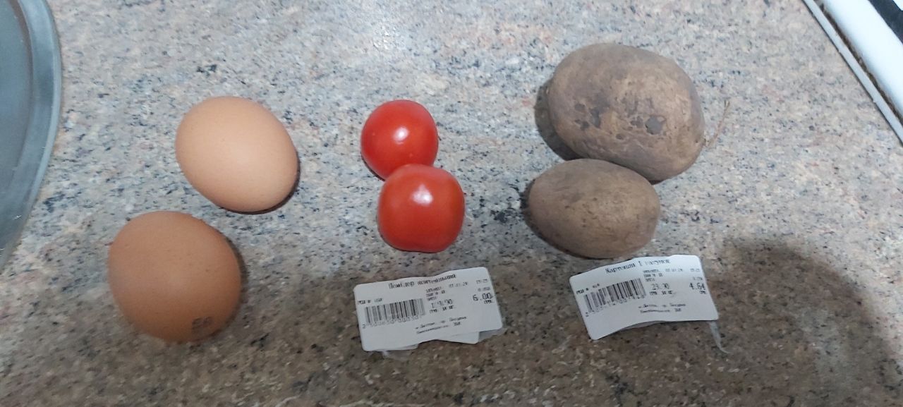 Вибрати картоплю було важко, тому ми купили дві невеликі за 4,64 грн. Помідори у нас коктейльні, два за 6 грн. І яйця по 4,29 за штуку. На буряк грошей не вистачило.
