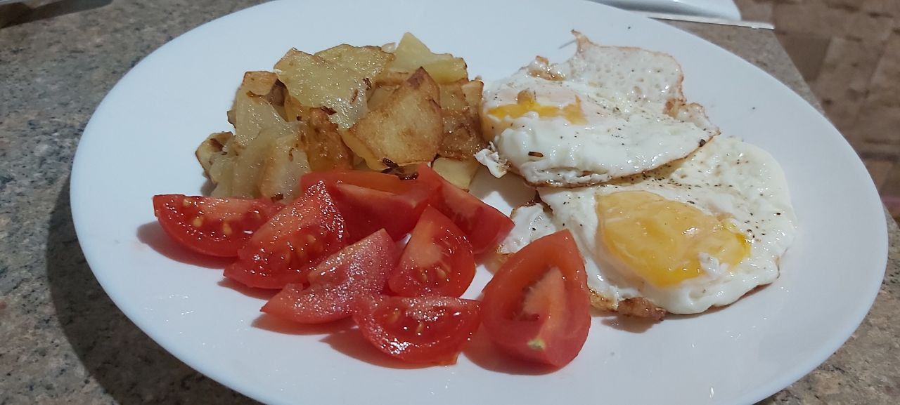 Вдома ми посмажили картоплю та яйця, помили та порізали помідори - ось така вечеря у нас вийшла.
