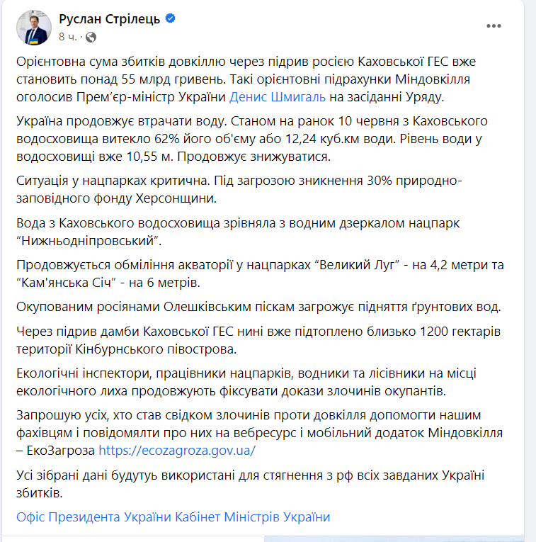 Міністр також додав, що екологічні інспектори, працівники нацпарків, водники та лісівники на місці екологічного лиха продовжують фіксувати докази злочинів окупантів.