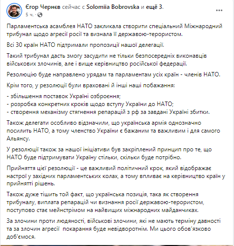 Парламентська асамблея НАТО закликала створити спеціальний Міжнародний трибунал щодо агресії росії та визнала її державою-терористом. Усі 30 країн НАТО підтримали пропозиції нашої делегації. Такий трибунал дасть змогу засудити не тільки безпосередніх виконавців військових злочинів, але і вище керівництво російської федерації. Резолюцію буде направлено урядам та парламентам усіх країн - членів НАТО, – написав Чернєв.