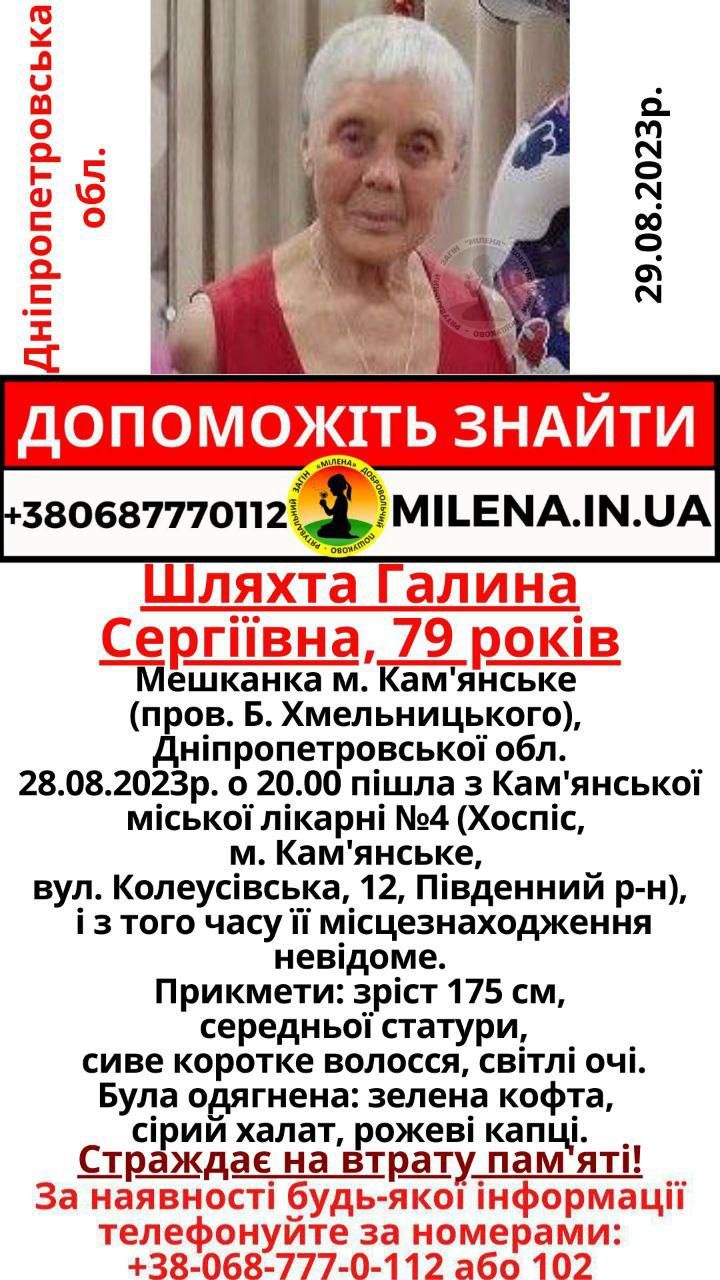 Відомо, що бабуся 28 серпня о 20:00 вийшла з лікарні у Кам'янському та зникла.