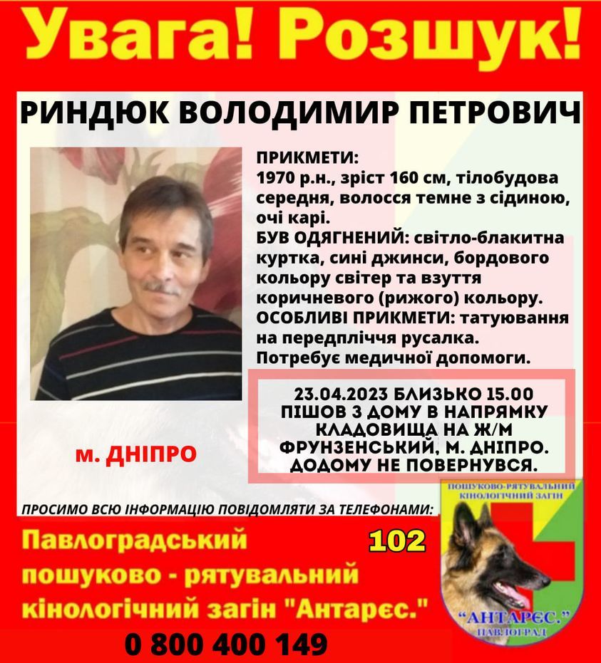 У Дніпрі шукають 53-річного Володимира Риндюка. Про це повідомляють волонтери Павлоградського кінологічного загону Антарєс.
