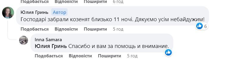 Усе закінчилося добре і наступного дня з'явилося повідомлення про те, що господарів чотирилапих знайшли й стадо кіз повернулося додому. Проте містяни тепер переживають за них, адже якщо тварини постійно губляться, значить власники не доглядають за ними належним чином.