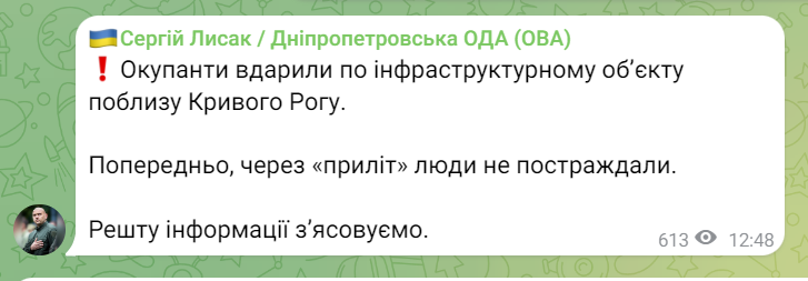 Окупанти вдарили по інфраструктурному об’єкту поблизу Кривого Рогу. Попередньо, через «приліт» люди не постраждали. Решту інформації з’ясовуємо, - написав Лисак.