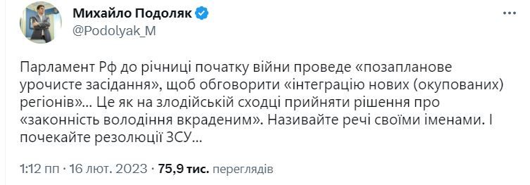 У своєму твітері Подоляк також зазначив, що перед річницею великого вторгнення відбудуються нові засідання в РФ. 21 лютого Путін виступить перед федеральними зборами. Він знов пояснюватиме, чому вони знищують іншу країну. А 22 лютого збереться російський парламент, аби зафіксувати своє "законне право" на окуповані регіони України.