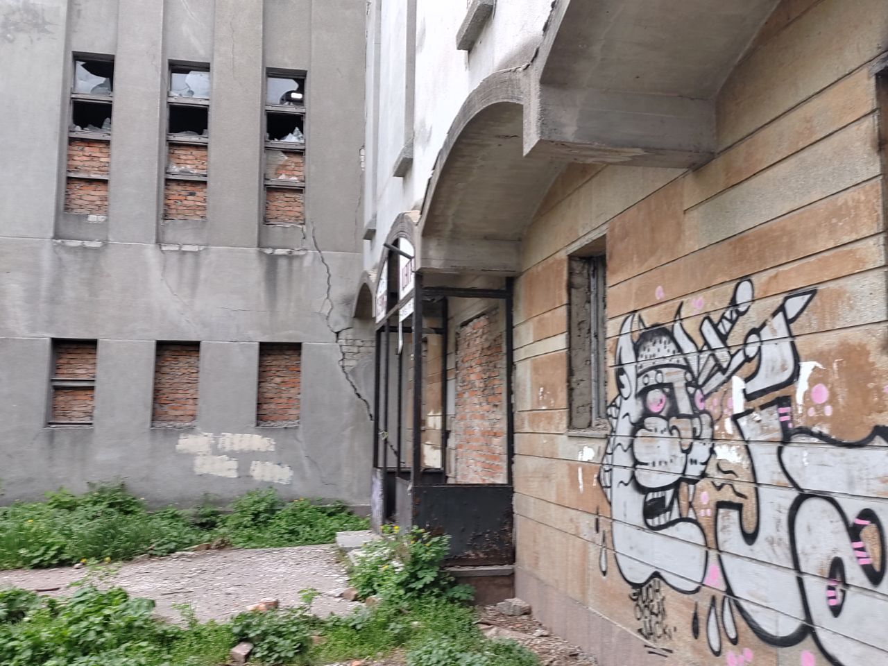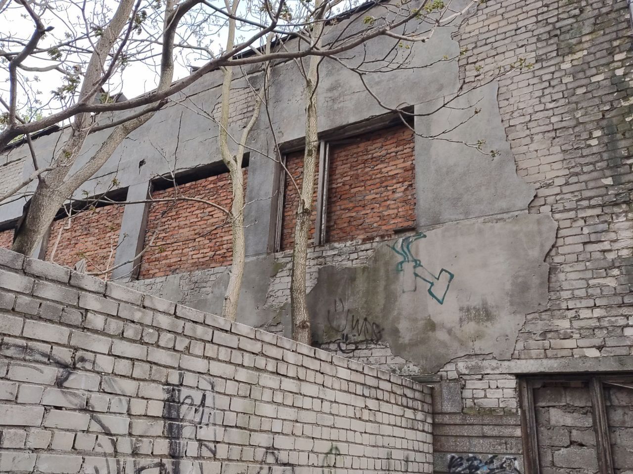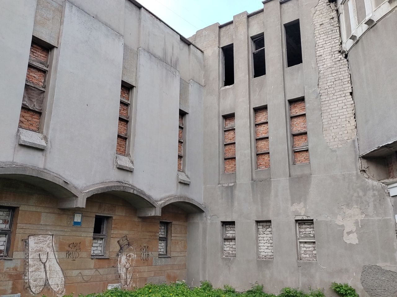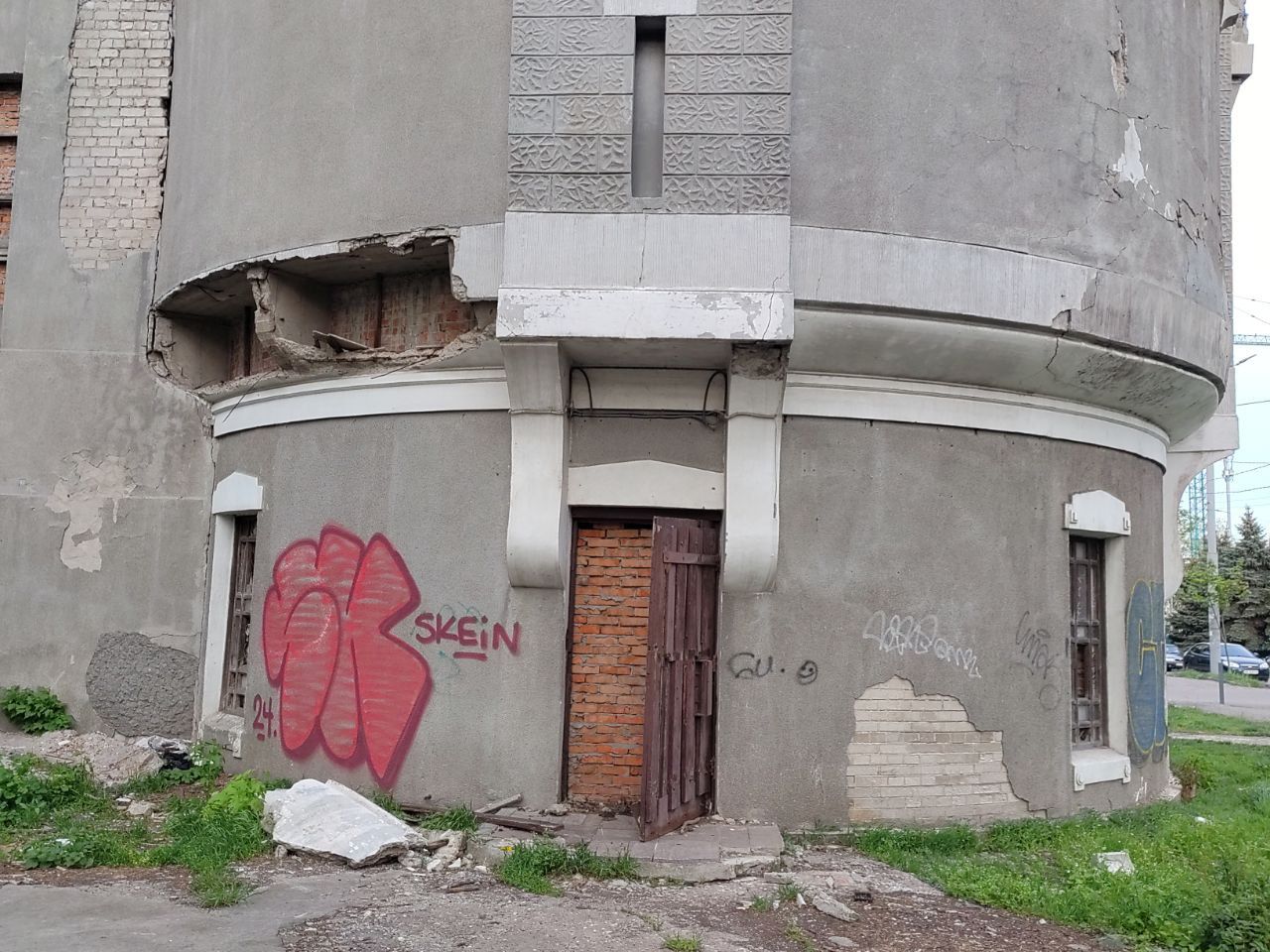 На вікнах третього поверху давно немає скла, стіни змальовані, частина штукатурки та фасаду обвалилася.