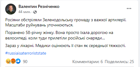 Вона просто їхала дорогою на велосипеді, коли туди прилетіли російські снаряди. Зараз у лікарні. Медики оцінюють її стан як середньої тяжкості, - зазначив Валентин Резніченко.