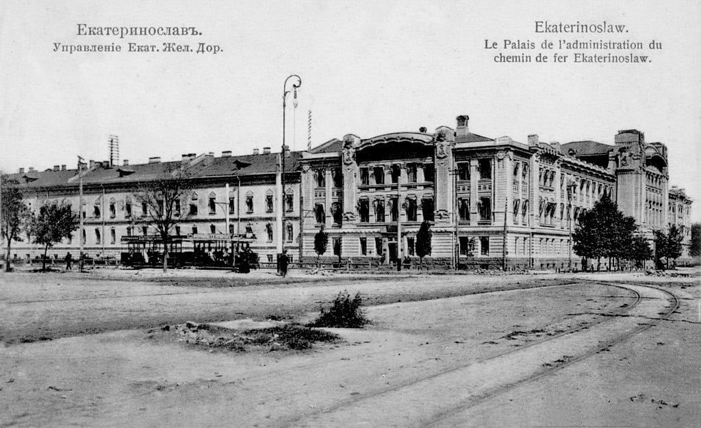 Будівлю управління Катерининською залізницею було зведено 1905 року. Особливістю її була велика кількість декору на фасаді та герб губернії на пілонах. У середині 1930-х було надбудовано четвертий поверх та знято частину декору. А під час Другої світової війни будівля згоріла. Відновили її лише у 1949 році, максимально спростивши зовнішній вигляд та прилаштувавши бічний корпус. Сьогодні вона зовсім не схожа на ту, яким її задумував архітектор. Єдине, що залишилося незмінним – трамвайні рейки, що проходять повз.
